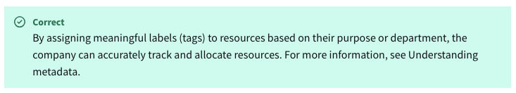 3. A cloud consultant is working for a company that uses cloud services for different aspects of their business. The company has deployed a diverse range of resources, including virtual machines, storage buckets, and databases. However, none of these resources have tags, and the data analytics team would like to track and optimize different components of the environment. The consultant decides to recommend the use of tag metadata to help the data analytics team perform their analysis. Which option BEST describes how the data analytics team should implement resource metadata?