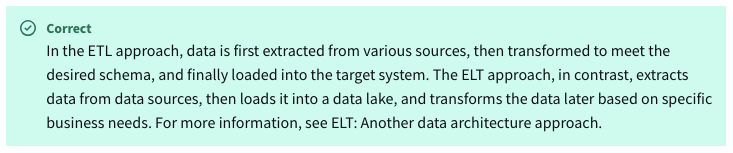 - ELT (Extract, Load, Transform): Data is extracted, then loaded directly into the destination (e.g., data lake or data warehouse), and then transformed there.