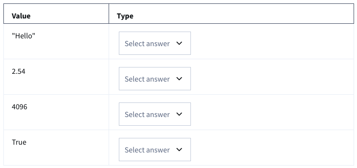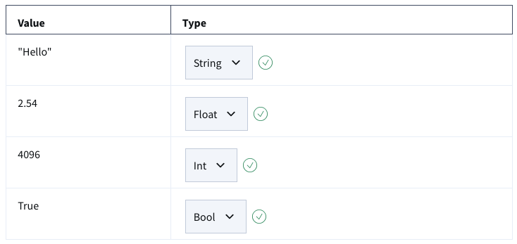 "Hello"is a sequence of characters → String2.54has a decimal → Float4096is a whole number → IntegerTrueis a logical value → Boolean