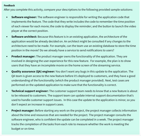 1. It’s time to reflect on what you learned about the different roles that work in software. For this activity, imagine that a company wants to add a new feature to their popular video streaming service. This feature will remind users if they haven’t finished watching a movie.