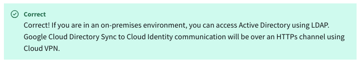 - Use Cloud VPN to connect the on-premises network to your Google Cloud environment. Select an on-premises domain-joined Windows Server. On the domain-joined Windows Server, run Configuration Manager and Google Cloud Directory Sync. Use Cloud VPN’s encrypted channel to transfer users from the on-premises Active Directory to Cloud Identity. ✅