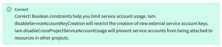 - Run the gcloud resource-manager org-policies allow command with the boolean constraints iam.disableServiceAccountKeyCreation and iam.disableCrossProjectServiceAccountUsage with Organization ID.