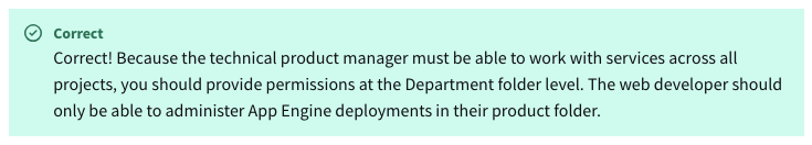 - Assign the Project Editor role at the Engineering Department folder level to the technical product manager. Assign the App Engine Deployer role at the specific product’s folder level to the web developer.