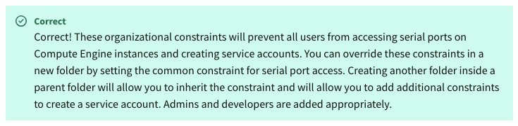 - Deny Serial Port Access and Service Account Creation at the Organization level. Create an ‘admin’ folder and set enforced: false for constraints/compute.disableSerialPortAccess. Create a new ‘dev’ folder inside the ‘admin’ folder, and set enforced: false for constraints/iam.disableServiceAccountCreation. Give developers access to the ‘dev’ folder, and administrators access to the ‘admin’ folder.