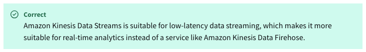 - Amazon Kinesis Data Streams, because it has lower latency when compared to Amazon Kinesis Data Firehose ✅