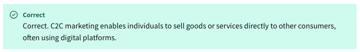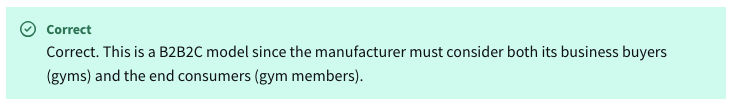 - B2B2C (Business-to-Business-to-Consumer) because the manufacturer sells to gyms (a business), which then serve consumers ✅