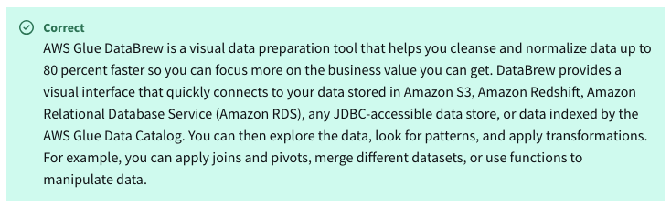 AWS Glue DataBrew is a visual data preparation tool that allows users to clean and transform data without writing code—perfect for teams without programming expertise.