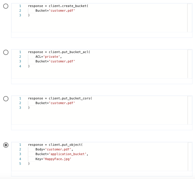 2. An application programmer is working on code to store a PDF file in Amazon Simple Storage Service (Amazon S3). What is the correct Python code to complete this task?