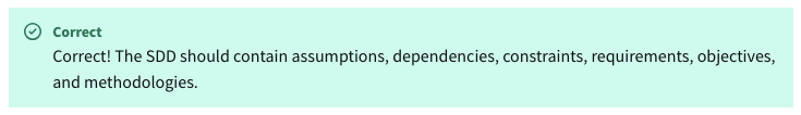 An SDD includes design constraints, system dependencies, and architectural decisions—not code or test cases.