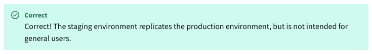 A staging environment mimics the production setup and is used for final testing before release, but it’s not accessible to end users.