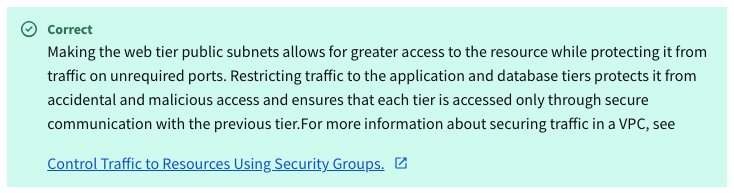 - Create a web server security group that allows HTTPS requests from the internet. Create an application server security group that allows requests from the web security group only. Create a database cluster security group that allows TCP connections from the application security group on the database port only. ✅