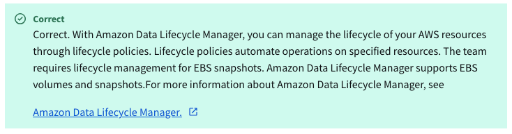 14. After reviewing the cost optimization checks in AWS Trusted Advisor, a team finds that it has 10,000 Amazon Elastic Block Store (Amazon EBS) snapshots in its account that are more than 30 days old. The team has determined that it needs to implement better governance for the lifecycle of its resources. Which actions should the team take to automate the lifecycle management of the EBS snapshots with the LEAST effort? (Select TWO.)
