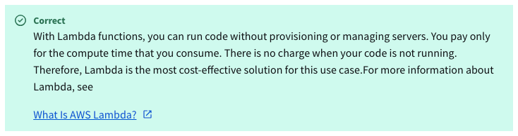 16. A prediction process requires access to a trained model that is stored in an Amazon S3 bucket. The process takes a few seconds to process an image and make a prediction. The process is not overly resource-intensive, does not require any specialized hardware, and takes less than 512 MB of memory to run. What is the MOST cost-effective compute solution for this use case?
