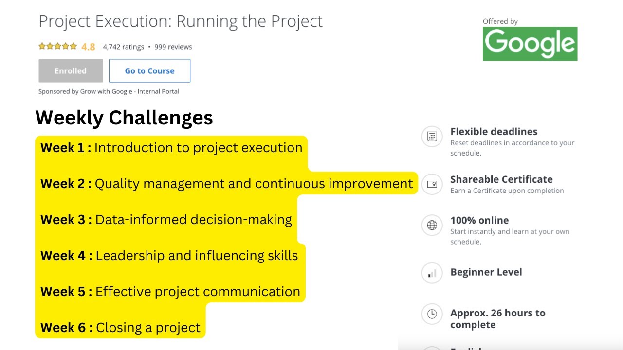 #coursera #courseraquizanswers #projectmanagement PROFESSIONAL CERTIFICATE - Google Project Management COURSE 4 - Project Execution: Running the Project Week 1 - Introduction to project execution Week 2 - Quality management and continuous improvement Week 3 - Data-informed decision-making Week 4 - Leadership and influencing skills Week 5 - Effective project communication Week 6 - Closing a project #career #job #certificate